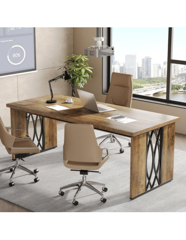 Skrivebord udført i et design af sortlakeret metal og MDF i brun træstruktur. Skrivebordet måler 76 cm i højden og 200 x 70 cm i bredde og dybde.